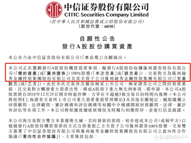 智通财经APP了解到,12月24日,中信证券发布公告,称该公司正在筹划关于公司发行股份购买资产事项,拟发行股份收购广州证券100%股权,交易对手为广州越秀金融控股集团股份有限公司及其全资子公司广州越秀金融控股集团有限公司,越秀金控也发布了此类的公告。