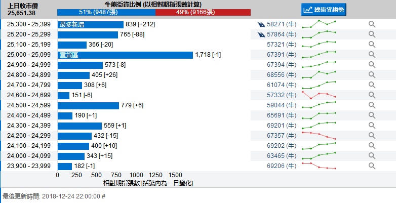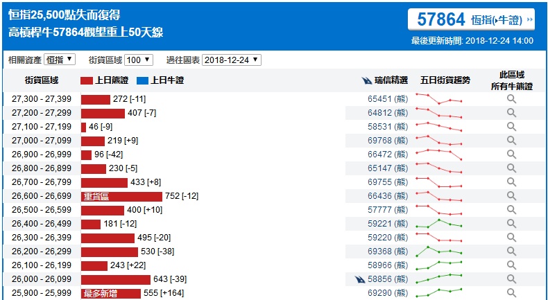 智通财经APP获悉,截至12月24日,恒指最新的牛熊街货比例51:49。从瑞信恒指牛熊证街货分布图中得到的数据显示,熊证街货重货区在26600-26699区间,该区间熊证数量为752张,比上一交易日减少12张;最多新增在25900-25999区间,新增164张。牛证街货重货区在25000-25099区间,该区间最新牛证数量为1718张,比上一交易日减少1张;最多新增在25300-25399区间,新增212张。