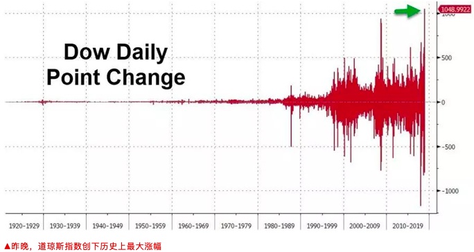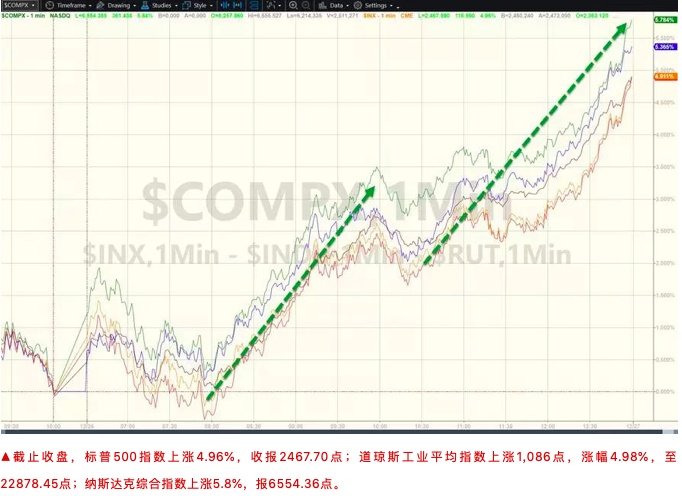昨晚,美国股市创出了奇迹——三大股指全部飙升4.9%以上,创下本轮9年半牛市以来的最大单日涨幅。在此之前,标普500指数距离熊市仅隔着一根头发丝的距离。