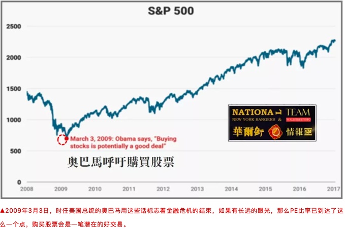 2009年3月3日,奥巴马在一个近乎完美的时点提出建议,“可能是时候买股票了”。(六天后,标普500触底,然后一涨数年,启动史上最长牛市。)