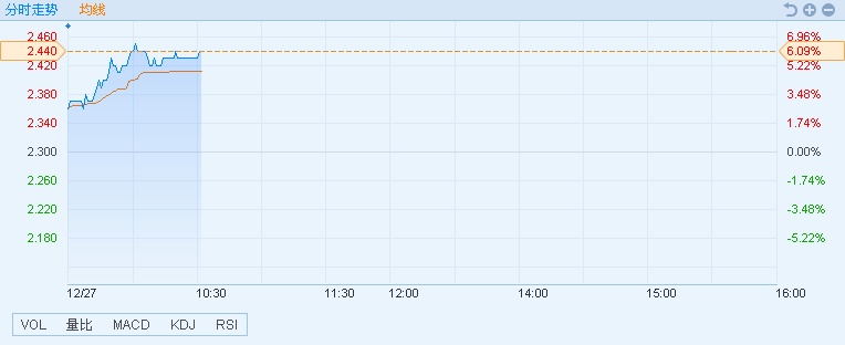 智通财经APP获悉,俄铝(00486)早盘小幅高开后震荡上行,截至10时34分,涨6.09%,报价2.44港元,成交额2750.72万港元。