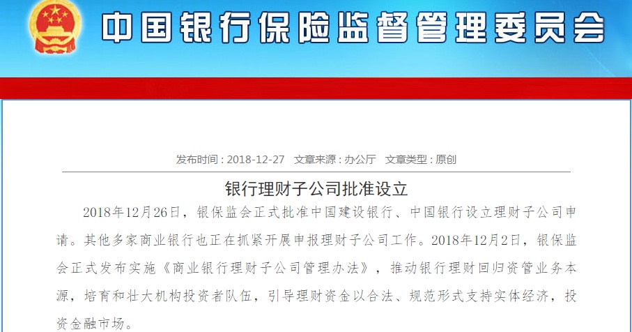 2018年12月26日,银保监会正式批准中国建设银行、中国银行设立理财子公司申请。其他多家商业银行也正在抓紧开展申报理财子公司工作。2018年12月2日,银保监会正式发布实施《商业银行理财子公司管理办法》,推动银行理财回归资管业务本源,培育和壮大机构投资者队伍,引导理财资金以合法、规范形式支持实体经济,投资金融市场。
