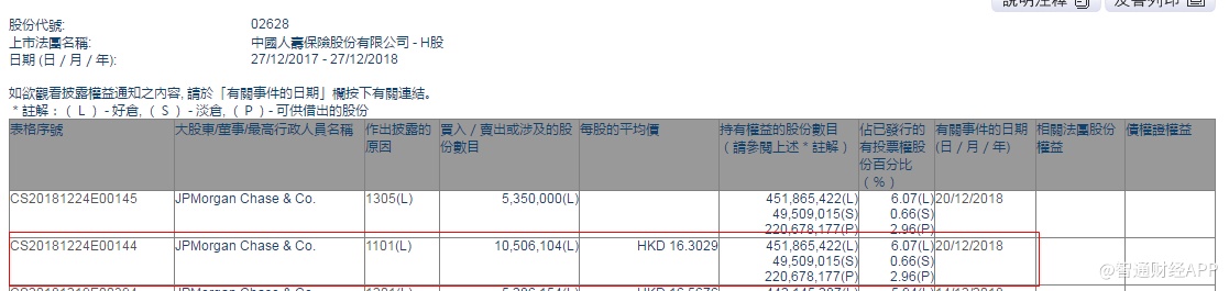 智通财经APP获悉,根据联交所资料显示,摩根大通于12月20日增持中国人寿(02628)1050万股,每股作价16.3029港元,总值1.71亿港元,最新持股数增至4.51亿股,最新持股比例增至6.07%。