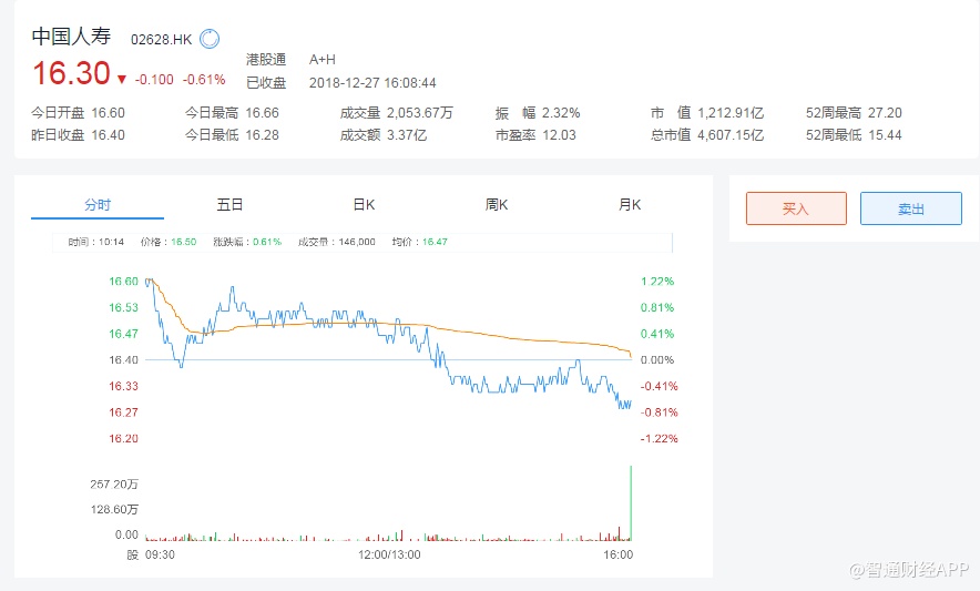 截至今日收盘,中国人寿跌0.61%,报16.30港元。