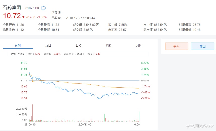 截至今日收盘,石药集团跌3.60%,报10.72港元。