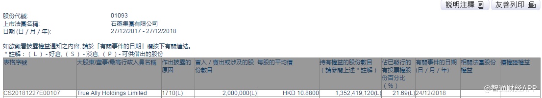 智通财经APP获悉,根据联交所资料显示,True Ally Holding Ltd于12月24日增持石药集团(01093)200万股,每股作价10.88港元,总值2176万港元,最新持股数增至13.52亿股,最新持股比例增至21.69%。