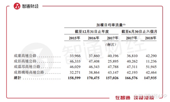 智通财经APP观察到,除了成彭高速,其它三条高速公路的车流量在过去三年都有显著增长,从2013年的112255辆次增至2017年的131131辆次,复合增长率为8%。