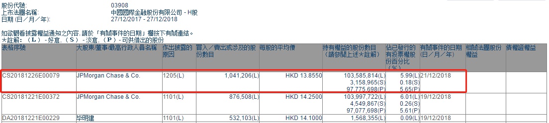 智通财经APP获悉,中金公司(03908)于12月21日被摩根大通减持104万股,每股作价13.8550港元,总值1441万港元,最新持股数目约1.03亿股,持股比例降至5.99%。