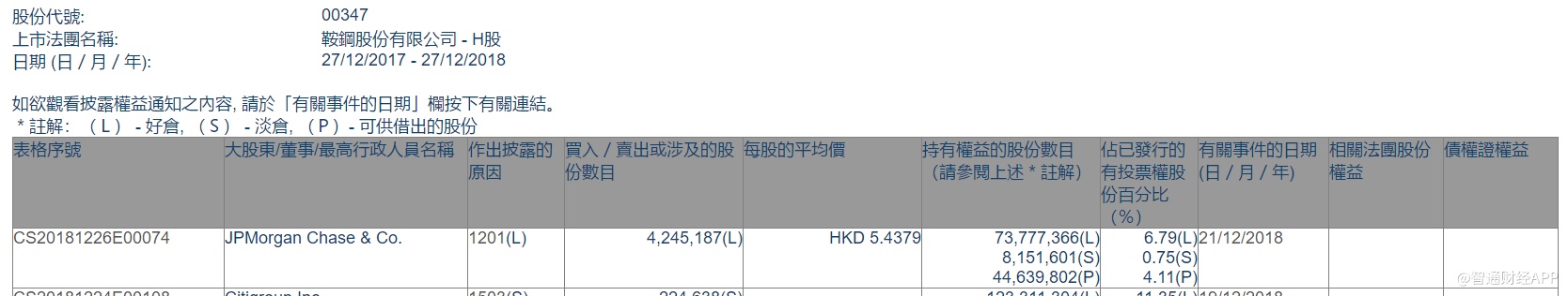 智通财经APP获悉,联交所股权变动资料显示,鞍钢股份(00347)于12月21日被摩根大通减持424万股,每股作价5.4379港元,总值2305万港元,最新持股数目7377万股。