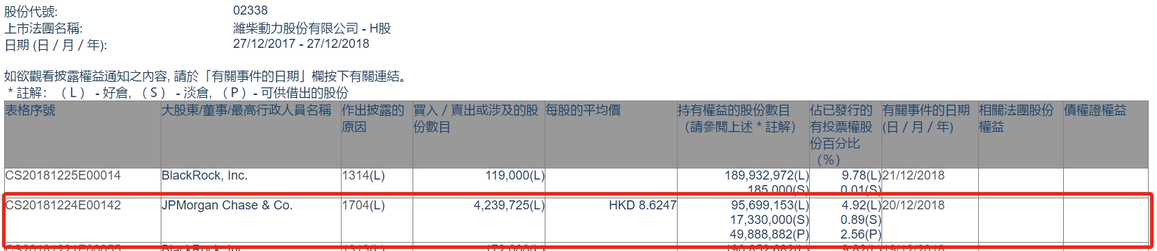 智通财经APP获悉,联交所股权变动资料显示,潍柴动力(02338)于12月20日被摩根大通减持423万股,每股作价8.6247港元,总值3648万港元,最新持股数目9569万股。