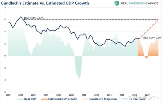 下表显示了Gundlach预测10年期国债收益率与经济增长之间的对比。(请注意,2000年美国GDP正奔向5.27%,而对比今天3.0%的GDP,经济增长就显得非常弱。)