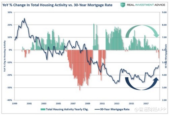 利率上升的最大问题是借贷成本增加所带来的负面影响。鉴于消费占经济增长的70%,及消费者负债累累,利率的变化将直接影响消费。以下为整体住房活动与30年期按揭利率的关系图。