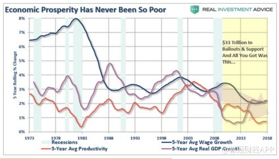 鉴于美国的经济结构背景,目前无法实质性提高生产率、产出、工资增长、储蓄及支撑经济强劲增长的消费。事实上,美国目前的经济增长率、生产力和工资水平都处于有史以来最低水平。