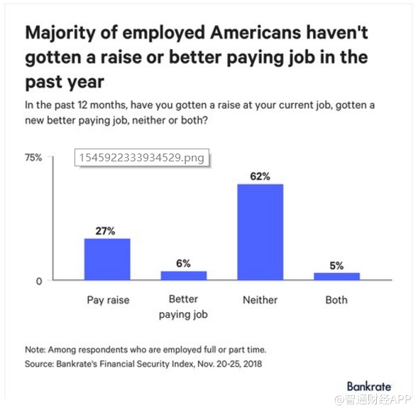 “调查显示,62%的美国人表示过去一年没有获得加薪或薪水更高的工作,这比去年调查时的52%有所上升。即便如此,在今年的调查中,也只有25%的受访者表示他们会在明年找份新工作。”