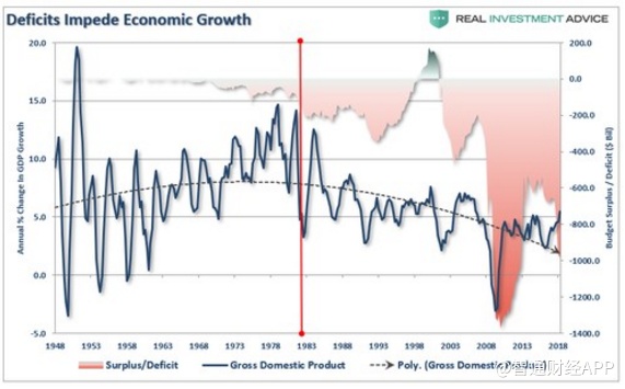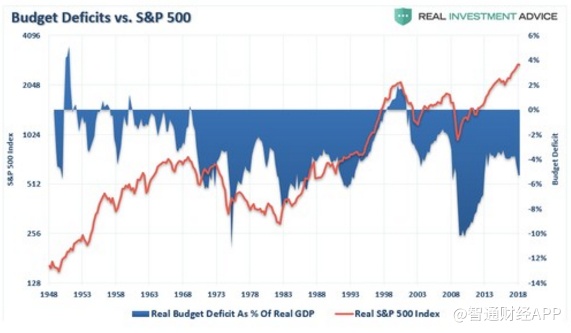 “需要注意的是,预算赤字占GDP的比例激增,通常与经济的‘衰退’活动有关。如此前所述,联邦开支的增加对经济增长产生了暂时性的促进作用,从而支持了更高的资产价格。但目前,无论是以美元计算,还是以GDP的百分比计算,美国政府都经历着历史上最大的赤字之一。而经济处于繁荣期的时候,在下一个雨天的时候也应该减少赤字。”