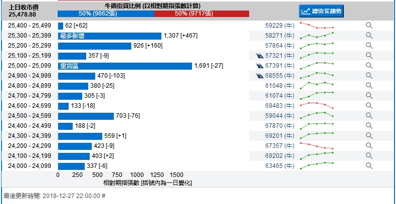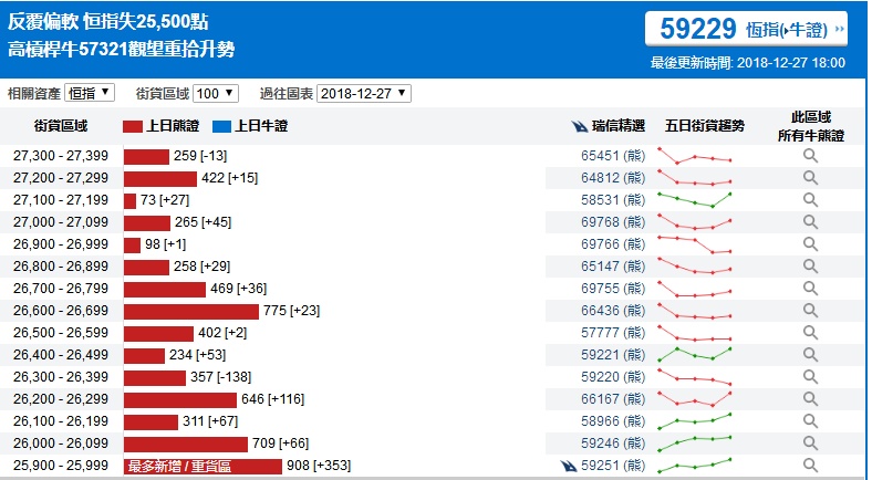 智通财经APP获悉,截至12月27日,恒指最新的牛熊街货比例50:50。从瑞信恒指牛熊证街货分布图中得到的数据显示,熊证街货重货区在25900-25999区间,新增353张,最多新增也在该区间。牛证街货重货区在25000-25099区间,该区间最新牛证数量为1691张,比上一交易日减少27张;最多新增在25300-25399区间,新增467张。