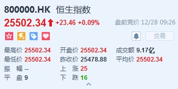 智通财经APP获悉,恒生指数开盘涨0.09%,报25502.34点。国企指数涨0.33%,报10024.18点。红筹指数涨0.42%,报4103.17点。大市盘前成交9.17亿港元。隔夜美股尾盘反弹,道指盘中最多跌超600点,尾盘突现反转,收涨逾1%。
