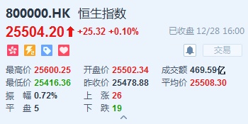 智通财经APP获悉,恒指早盘高开0.09%,报25502.34点。截至收盘,恒生指数涨25.32点或0.1%,报25504.2点,全日成交额达459.59亿。国企指数涨0.01%,报9992.22点,红筹指数涨0.69%,报4114.33点。港股通因节假日关闸。