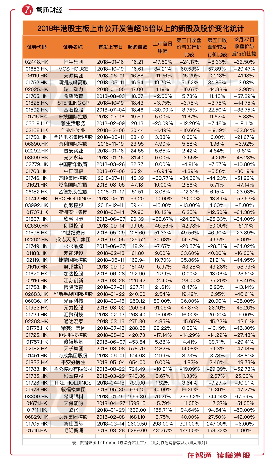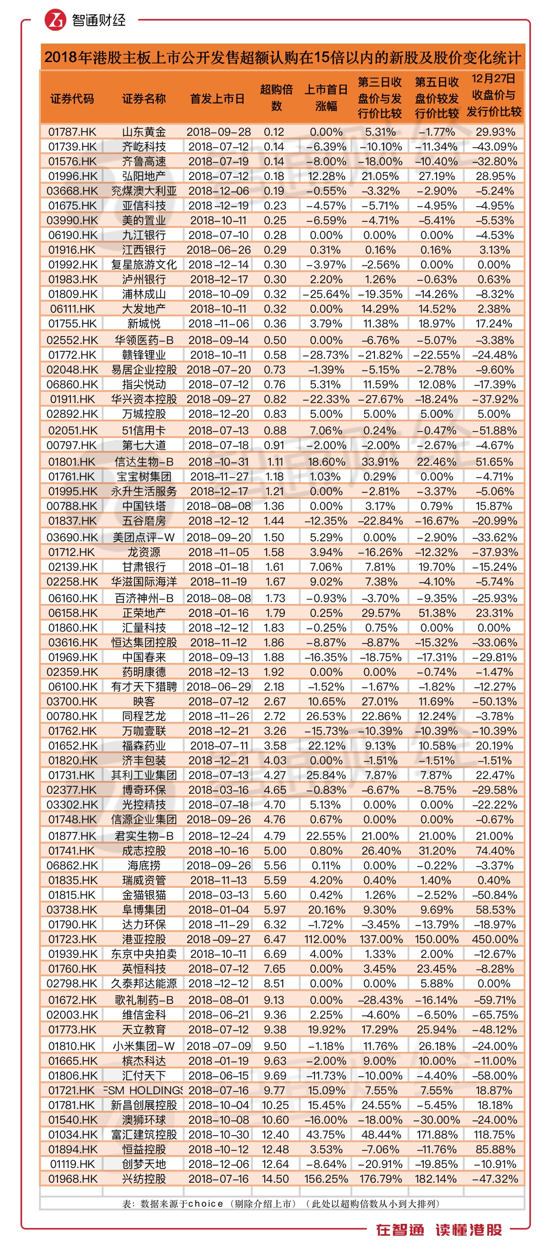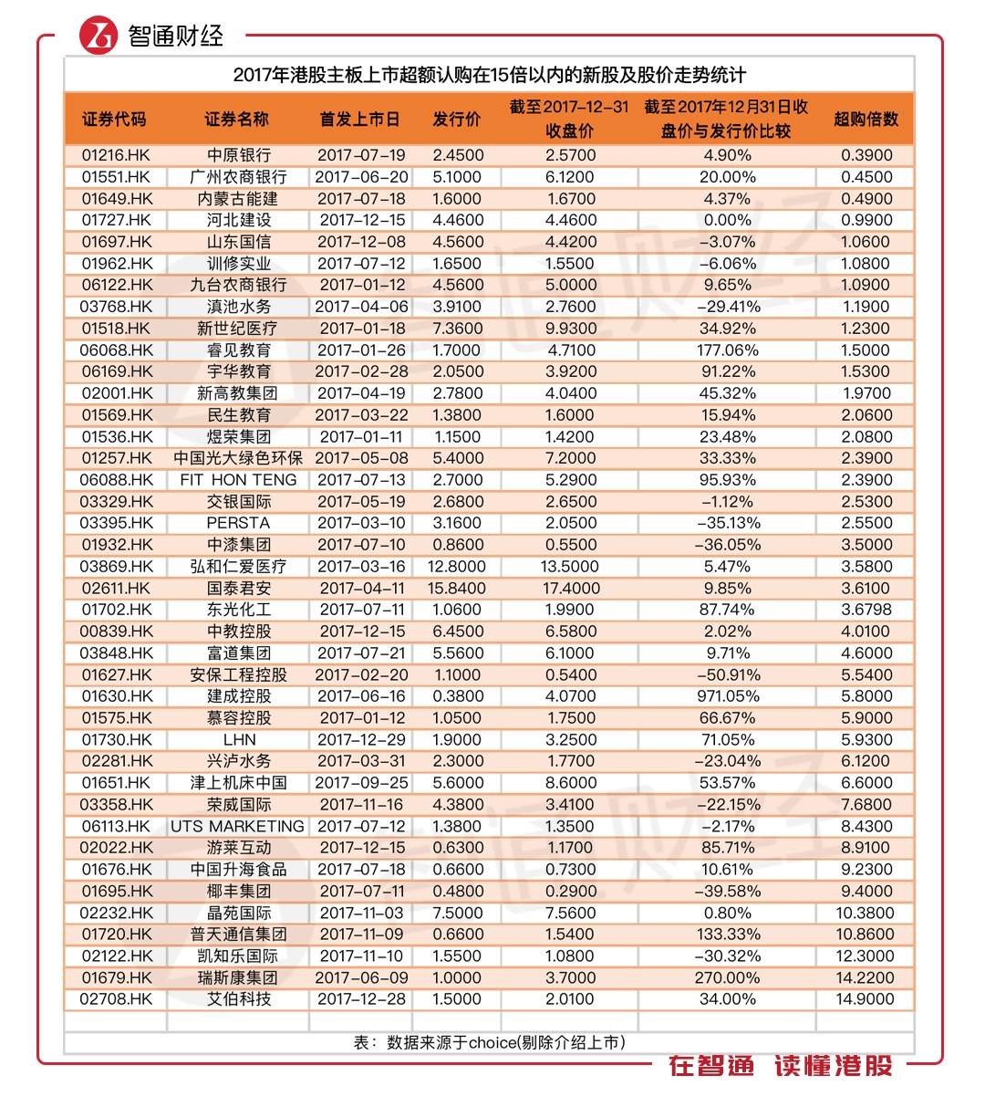 找到了高超购倍数新股破发的主要原因,那么对于超购倍数低的新股而言,2018年66.19%的破发率是否正常?为此,智通财经APP再次整理了2017年港股主板上市时超购倍数在15倍以内的新股数据。