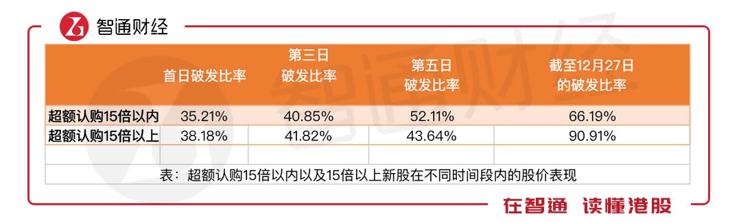 但若将时间拉长,截至12月27日时,两者之间的差距已经很明显,认购超15倍以上的破发率高达90.91%,较15倍认购额以内的新股的破发率高出24.72个百分点。