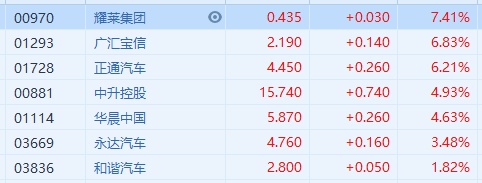 智通财经APP获悉,汽车经销商股早盘齐齐发力,集体上扬,截止发稿,耀莱集团(00970)涨8.64%,广汇宝信(01293)涨7.32%,正通汽车(01728)涨6.92%,华晨中国(01114)涨4.99%。