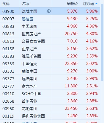 截至11时05分,佳兆业集团(01638)涨9.59%,绿城中国(03900)涨5.96%。碧桂园(02007)涨5.25%,报9.43港元。中国奥园(03883)及世茂(00813)涨超4%,中国恒大(03333)及融信(03301)升逾3%。