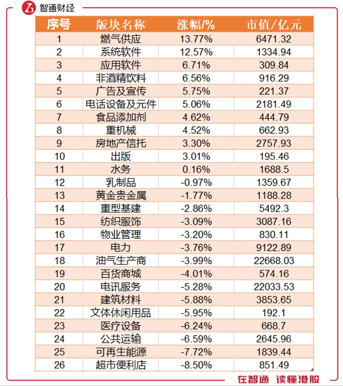 行业板块中有两个板块涨幅上双,燃气供应、系统软件以13.77%、12.57%的涨幅位列榜单一二名,应用软件、非酒精饮料、广告及宣传分别以6.71%、6.56%及5.75%位于三、四、五名。