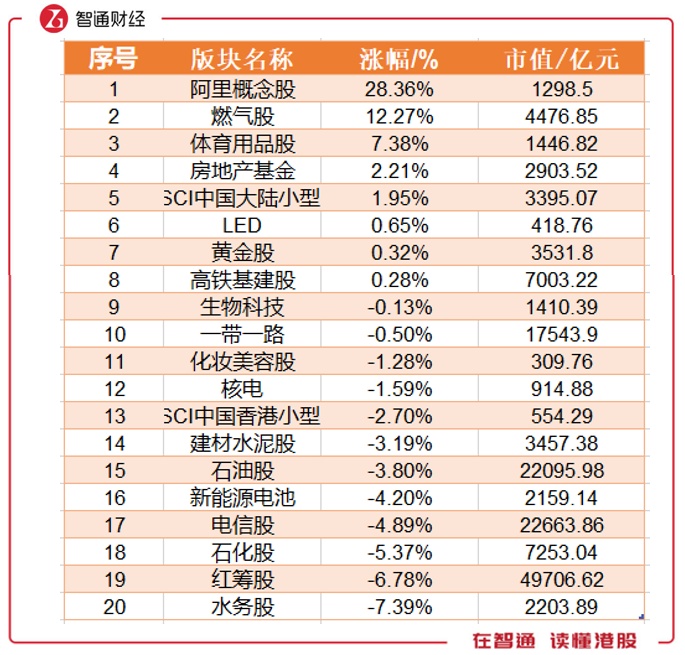 前八名均有上涨,阿里概念股以28.36%的涨幅问鼎,燃气股12.27%的涨幅位居第二。