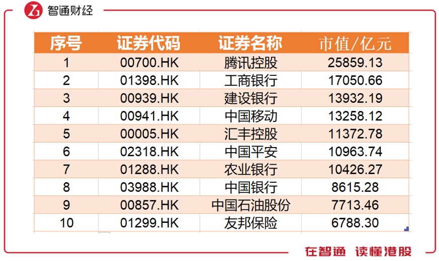 市值前十均在5000亿元以上,腾讯控股以25859亿元的市值领跑榜首,工行、建行分列二三名。
