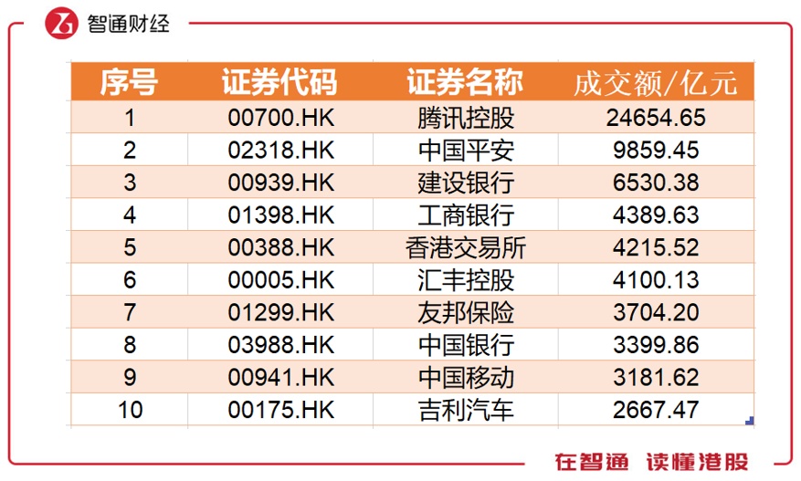 2018年,成交额榜单上银行股仍占大多数。腾讯控股以24655亿元的成交额高居榜首,中国平安则以9859亿元成交额紧随其后。