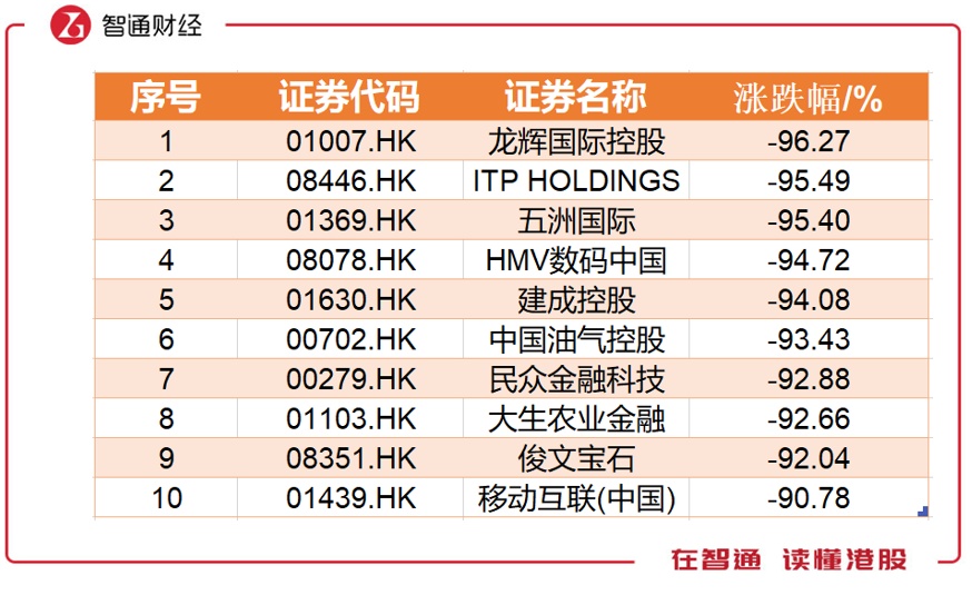跌幅榜方面,前十名跌幅均超90%,榜首的龙辉国际控股今年7月份上市后便遇破发,全年累计跌幅达到96.27%,如今股价仅0.107。