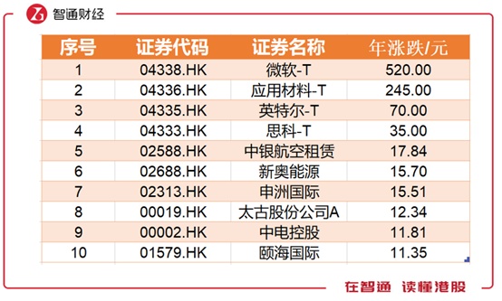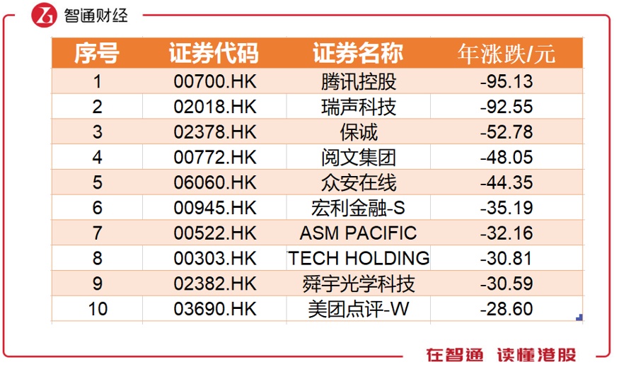 2018年个股涨跌额度方面总体惨淡,前四名为美股明星股,在港上市股票中中银航空租赁位列第一,仅增加17.84元。腾讯控股全年累计下跌95.13元,位居第一。