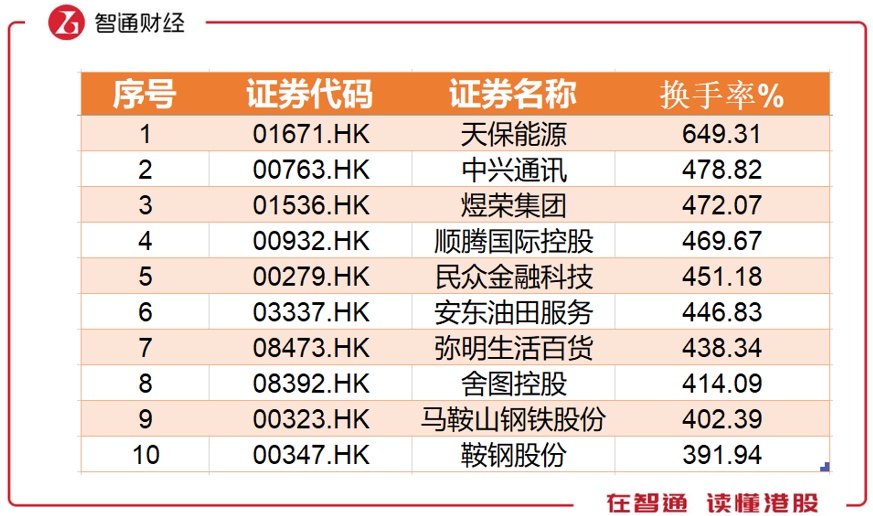天保能源以649.31%的换手率高居榜首,第二名至第十则较为集中,中兴通讯为478.82%,第十名鞍钢股份则为391.94%。