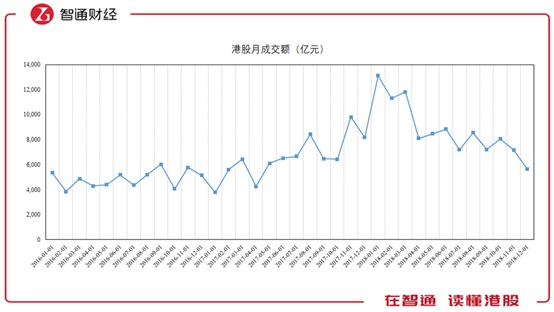 2018年港股月成交额整体呈下降趋势,年初1月份尚有1.3万亿成交额,年末12月份只有5600亿元,回落至2016年水平。