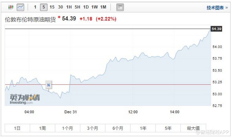 智通财经APP获悉,布油、WTI原油价格均大涨,截至发稿,布油上涨2.22%,刷新日高至54.39美元/桶。