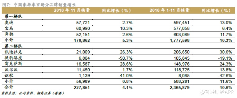 前11月豪华车市场同比增长10.6%,豪华车市场增速跑赢行业,同期汽车行业累计销量同比下降1.7%。分品牌来看: