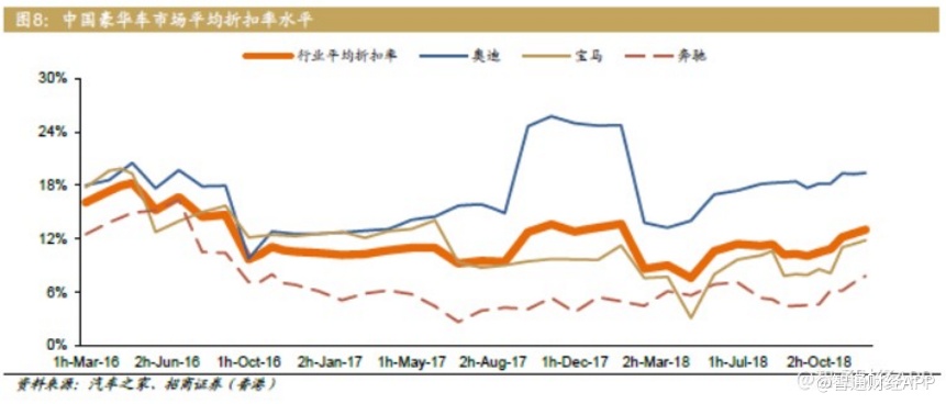 我们的渠道调研显示,12月豪华车市场平均折扣率在13%左右,其中,奥迪折扣力度最大,12月折扣率为19%,和上个月基本持平。奔驰折扣上升幅度最高,12月折扣率同比提升1.7个百分点,但折扣力度在三大豪华品牌阵容中保持最低。宝马折扣率较上个月同比提升0.8个百分点至12%,价格承压。折扣上升源于: