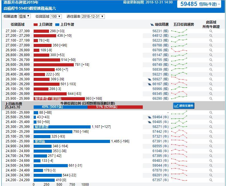 智通财经APP获悉,截至1月1日,恒指最新的牛熊街货比例49:51。从瑞信恒指牛熊证街货分布图中得到的数据显示,熊证街货重货区在25900-25999区间,该区间最新熊证数量为993张,增加168张,最多新增在同一区间。牛证街货重货区在25000-25099区间,该区间最新牛证数量为1485张,比上一交易日减少196张;最多新增在25300-25399区间,新增127张。