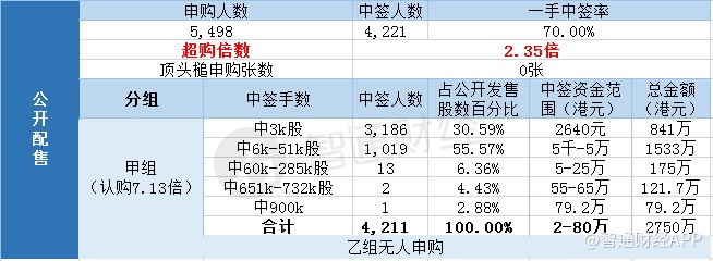 其中,公开配售申购人数5498人,一手中签率70.00%,认购倍数2.35倍。