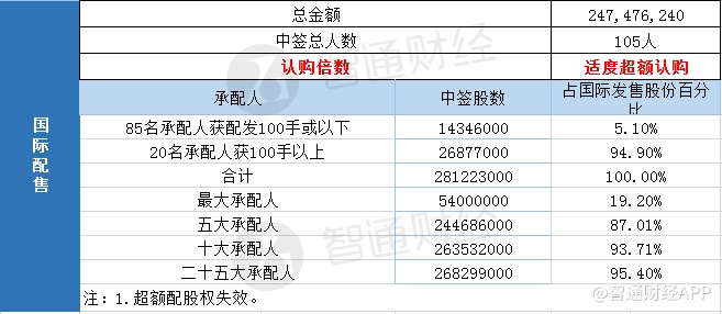 国际配售中签总人数105人,认购倍数为适度超额认购。