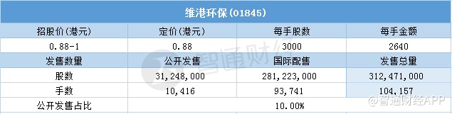 智通财经APP获悉,1月2日,维港环保(01845)配售结束。配售招股价区间为0.88-1港元,最终定价0.88港元,每手2640港元。