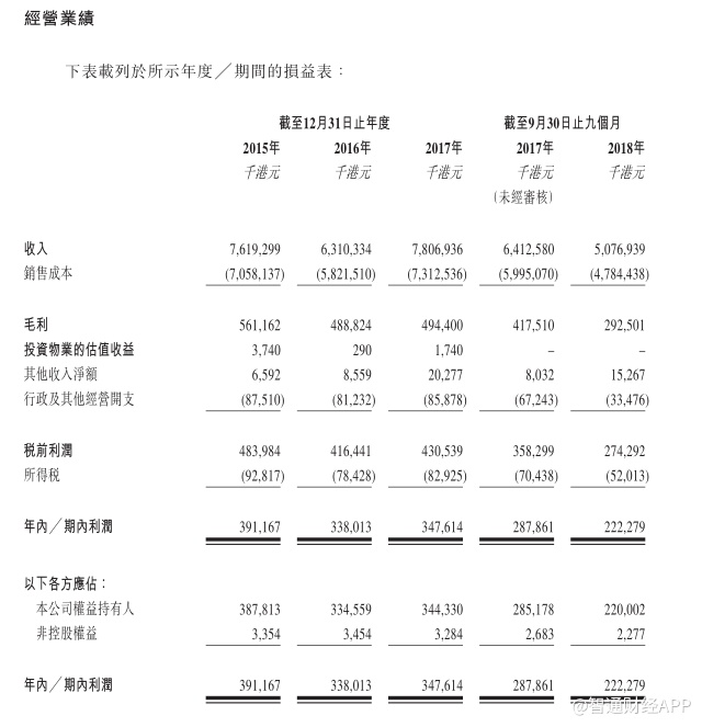 而在过去三年中,公司的业绩整体表现则相对平稳。2015年-2017年,公司实现收入分别为76.19亿港元、63.1亿港元和78.07亿港元,毛利分别为5.61亿港元、4.89亿港元、4.94亿港元,净利润分别为3.91亿港元、3.38亿港元及3.48亿港元。