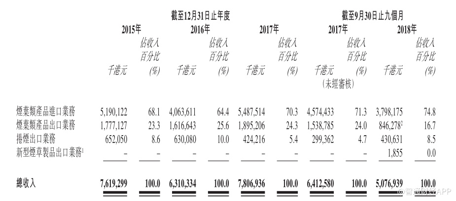据智通财经APP观察,中烟国际(香港)2018年前9个月的业绩出现波动,主要是烟叶类产品的进口和烟叶类产品的出口两块业务的收入出现了较大地下滑。期间,烟叶产品的进口的收入为37.98亿港元,虽然该业务的收入比重较2017年提高了3.5%至74.8%,但是较同期下降了17%;烟叶类产品的出口的下降幅度更大,收入为8.46亿港元,同比下滑45%。