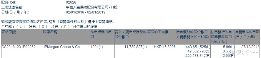 智通财经APP获悉,港交所权益披露显示,摩根大通于2018年12月27日减持中国人寿(02628)1173万股,每股作价16.39港元,涉资约1.9225亿港元,最新持股数目约4.43亿股,持股占比降至5.96%。