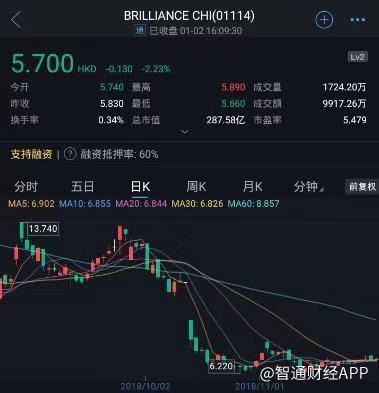 截至今日收盘,华晨中国(01114)报5.7港元,跌2.23%。