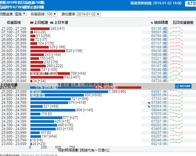智通财经APP获悉,截至1月2日,恒指最新的牛熊街货比例57:43。从瑞信恒指牛熊证街货分布图中得到的数据显示,熊证街货重货区在25000-25099区间,该区间最新熊证数量为1389张,减少96张,最多新增在24900-24999区间,新增608张。牛证街货重货区在26000-26099区间,该区间最新牛证数量为708张,比上一交易日增减64张;最多新增也在这一区间。