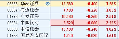 智通财经APP获悉,A股券商板块盘中飙升,板块整体涨幅超4%,板块内方正证券(601901)冲击涨停,国海证券(000750),中信建投(601066)涨超7%,港股中资券商股跟涨,截至发稿,华泰证券(06886)涨3.28%,海通证券(06837)、广发证券(01776)、中国银河(06881)涨超2%。