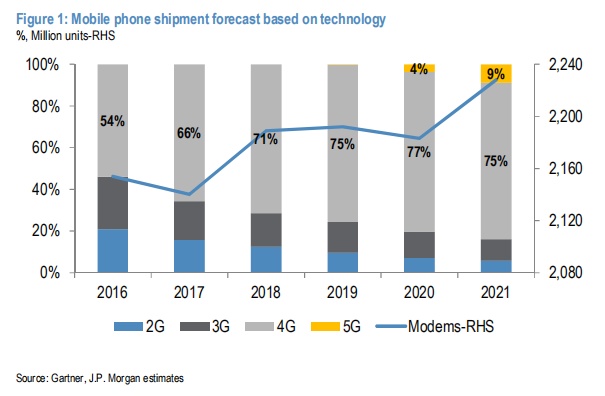 小摩预测,2019年,5G手机出货量约500万部(占手机总出货量不足1%),2020增加至8000万部(占手机总出货量4%),2021年2亿部(占手机总出货量9%),