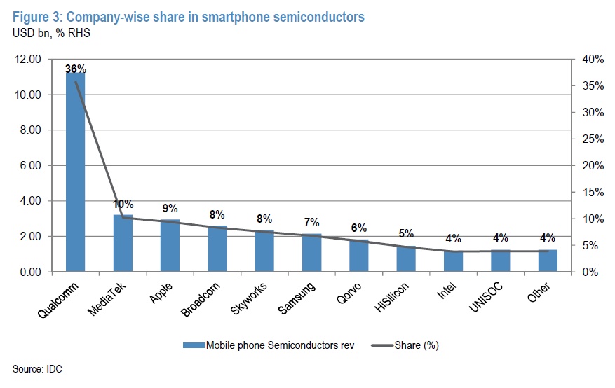 5G浪潮之下,最先受益的其实是半导体供应链。5G毫米波需要单独的RF芯片组,低频段5G设计除了用于LTE的射频组件之外,还需要额外的硅材料。小摩预计,像高通和联发科这样的芯片制造商,仍将是集成/离散基带处理器和收发器的主要供应商,也是获得智能手机半导体收入最大份额的芯片制造商。