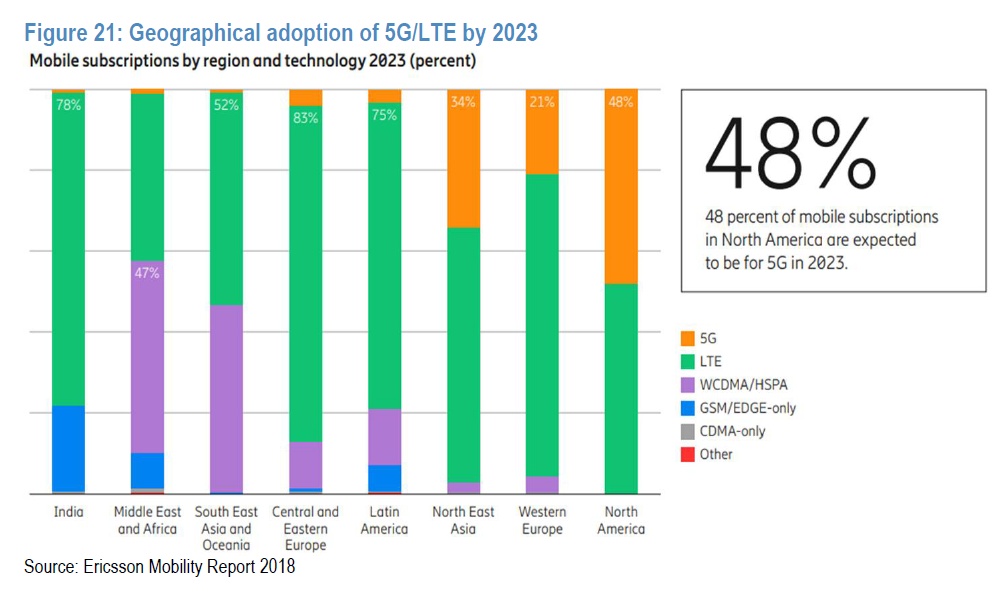 据爱立信称,5G固定无线服务从2018年末开始启动,到2023年,北美地区5G用户将占总手机用户量约50%。在亚洲,韩国、日本、中国将是最早采用5G的国家,2023年5G用户将占中手机用户数的超过30%。